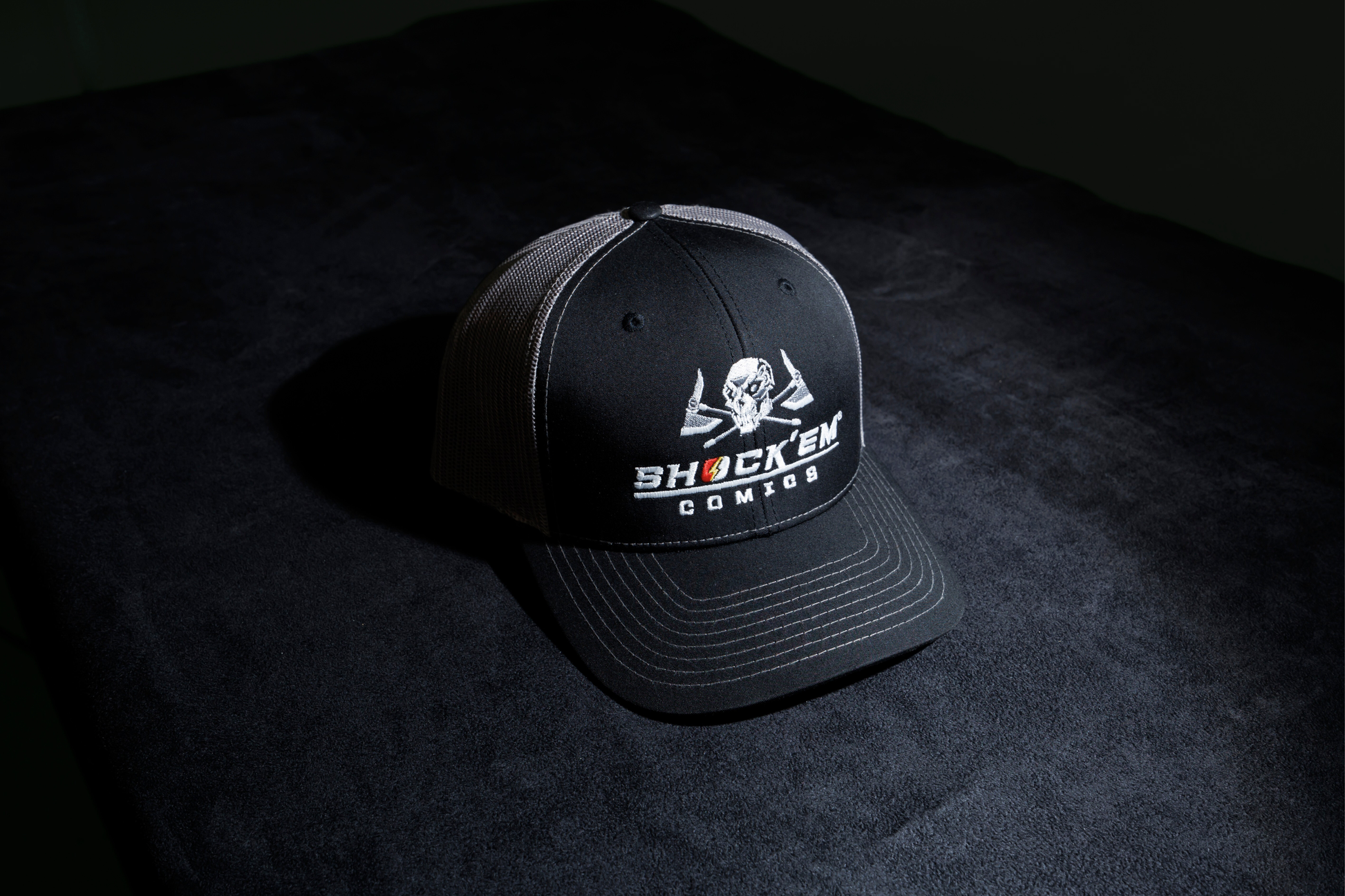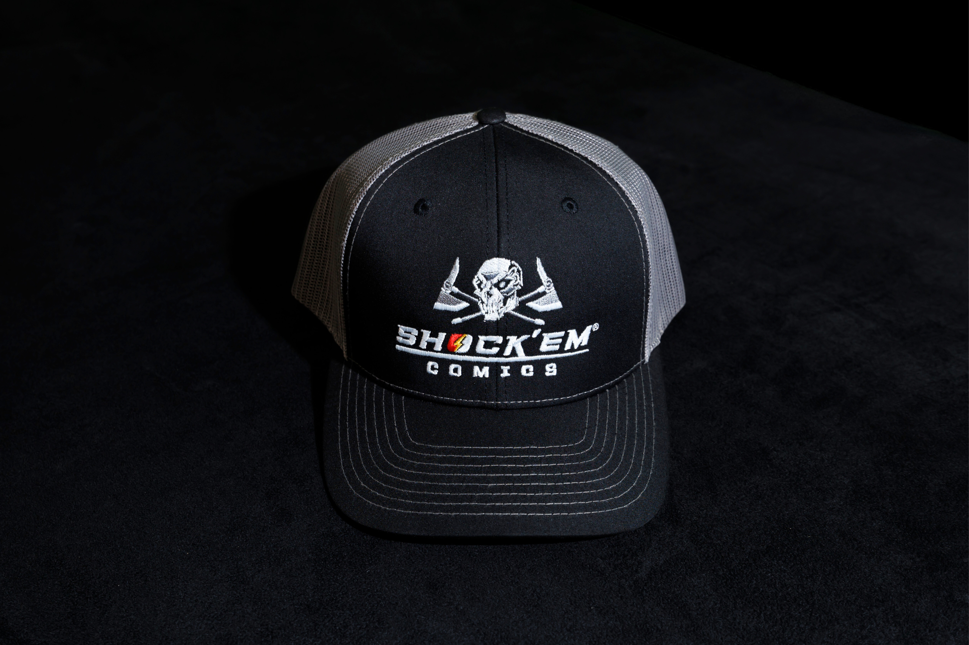 Keep it classic with a little edge. The Deadhead Trucker Hat features an embroidered design of Deadhead’s skull and crossed axes above the Shock’em Comics logo. Built on the trusted Richardson Trucker Hat design, it’s crafted from 100% recycled polyester front panels and a recycled polyester mesh back, offering breathability and a quality feel you can wear every day.